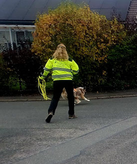 Mit klarer Ausrichtung, engagierter Führung, energischen Schritten und sicherem Griff der Leine folgt die Hundeführerin dem Hund, der sich zielgerichtet auf die Spur einlässt, während er genügend Raum hat, seine Aufgabe zu erfüllen. Die Bewegung des Teams zeigt: Hier wird gearbeitet, mit klarer Ausrichtung und dem Blick nach vorne. Jeder Anstoß bringt sie näher ans Ziel, eine perfekte Verbindung aus Bewegung und Entschlossenheit.