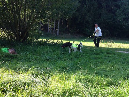Passioniert für die Nasenarbeit läuft er seine Einsteiger-Trails hoch motiviert ab. Gibt durch seine Körpersprache die Richtung vor und arbeitet sich willensstark in das Versteck der VP.