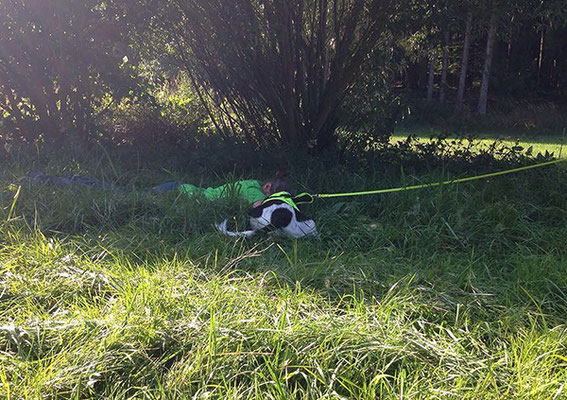 „Der kleine Münsterländer" mit seinem fröhlichen und unbekümmerten Wesen hat das Trailen für sich entdeckt. Gismo ist temperamentvoll, aufmerksam und intelligent. Ein leidenschaftlicher Jagdhund, der entsprechend Beschäftigung braucht.